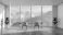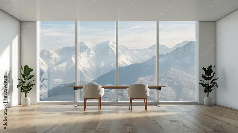 A minimalist office space featuring two chairs and a desk facing large panoramic windows with a breathtaking view of snow-capped mountains. The room is bright with natural light #887596930