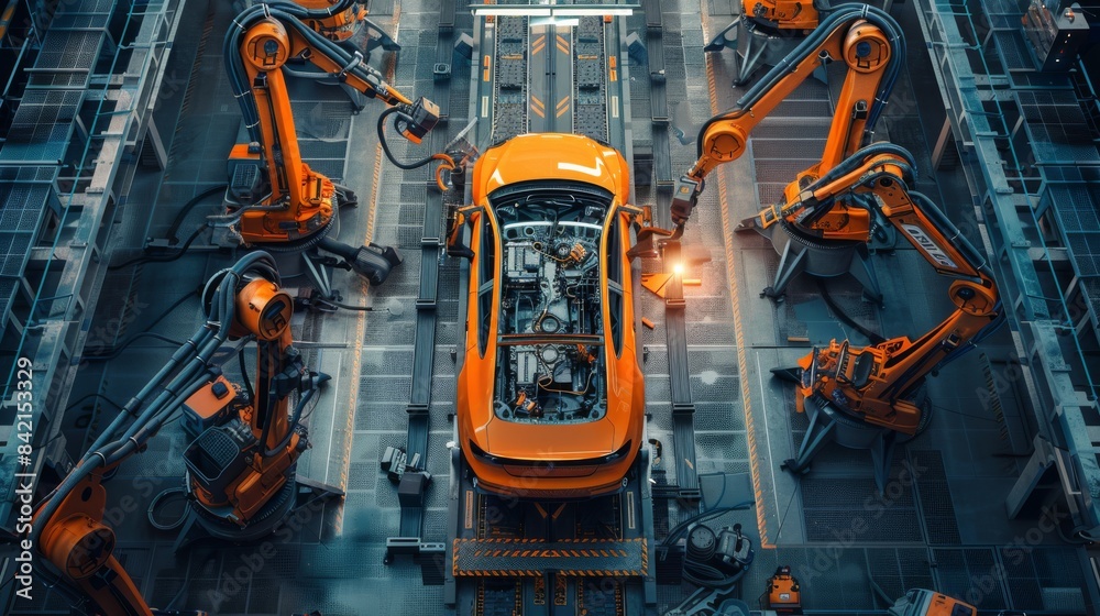 A modern automotive factory efficiently produces cars using an Automated Robotics Assembly Line with robotic arms, incorporating Industry 4.0 technology for advanced manufacturing processes #842153329