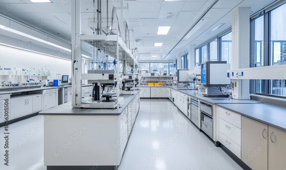 a modern, clean, and spacious laboratory with lab benches, equipment, and bright lighting. The lab is well-organized and appears to be designed for scientific research or experiments. #1066305506