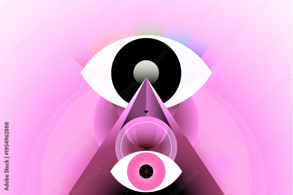 A modern flat vector illustration featuring a stylized all-seeing eye, a pyramid, and spheres on a pink gradient background. #1954962888