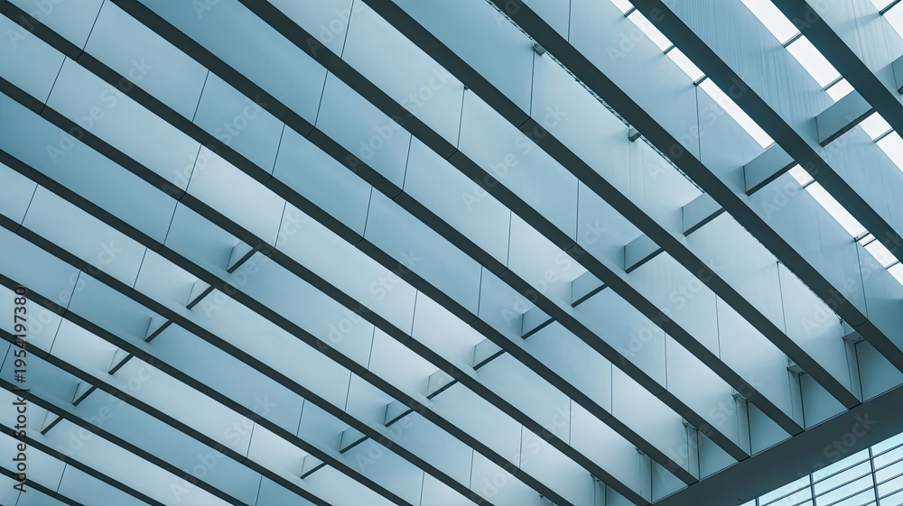A modern glass roof with sleek metal beams and a blue sky background #1954197380