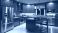 a modern kitchen with stainless steel appliances and black counter tops and cabinets, and a center island with a black countertop and stools. generative ai #570619515