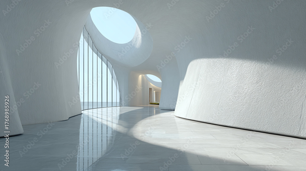 A modern, minimalist building interior, with curved walls and natural light from above. The structure has a sleek, polished look. #1768985926