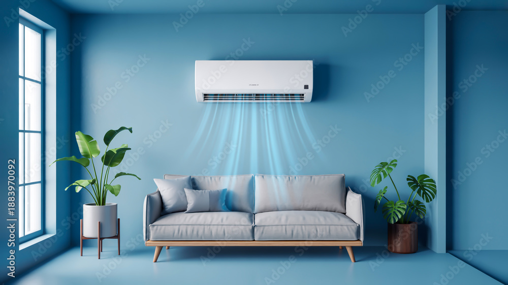 A modern minimalist living room interior with a light blue wall and floor #1883970092