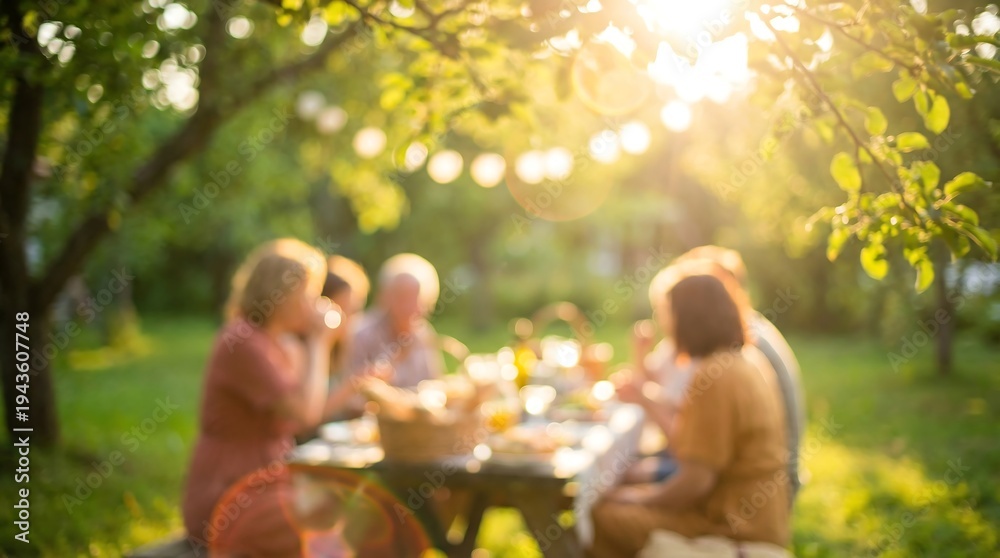 A multi-generational family is happily gathered around a wooden table, enjoying an outdoor meal in a lush garden, bathed in warm sunlight and fairy lights. #1943607748