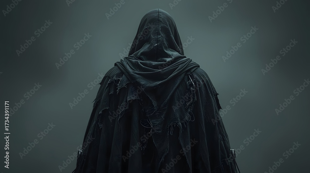 A mysterious, hooded figure dressed in a dark, tattered cloak, viewed from the back against a simple, somber dark grey studio background, symbolizing anonymity or death #1734391171