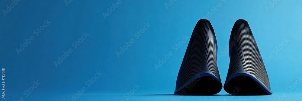 A pair of sleek, modern shoe lasts displayed against a vibrant blue background. #978243153