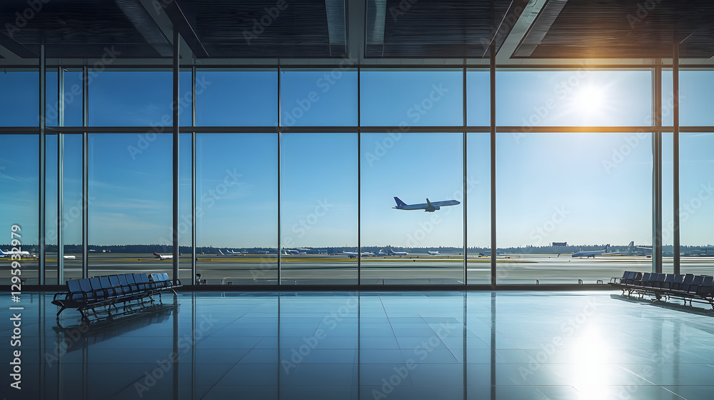 A panoramic view of an airport terminal, with large windows overlooking the runway and airplanes visible outside #1295932979