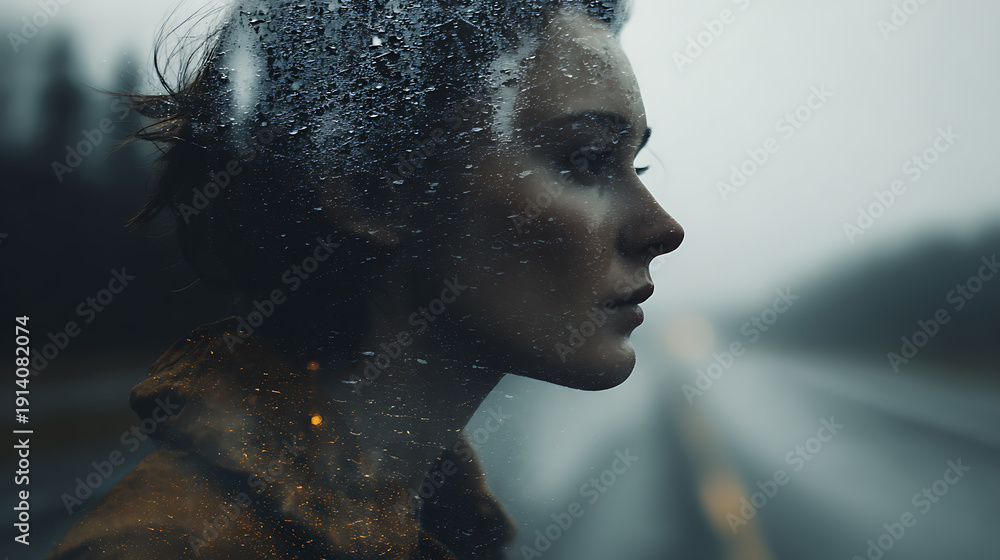 A pensive woman's portrait, captured with a blend of artistic filters, staring thoughtfully into the distance near a road. The image conveys a sense of introspection and melancholy #1914082074