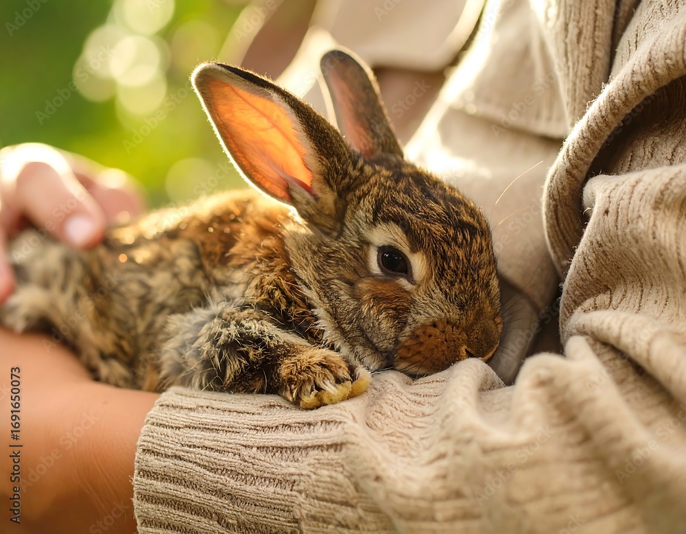 A person gently holding a small brown rabbit outdoors #1691650073