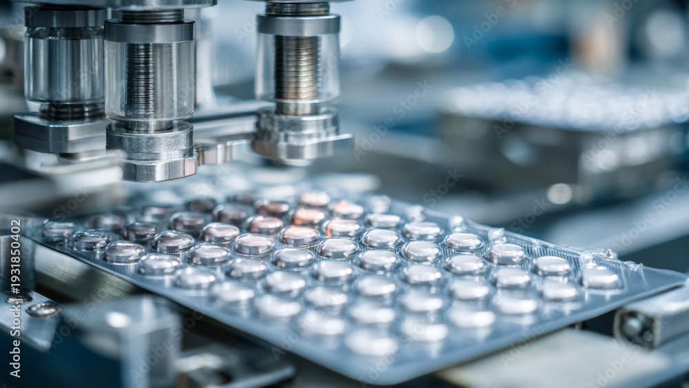 A pharmaceutical blister packaging machine sealing tablets. #1931850402