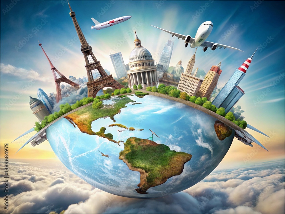 A plane flying above the middle of the globe with famous places on the edge of the globe #1394684975