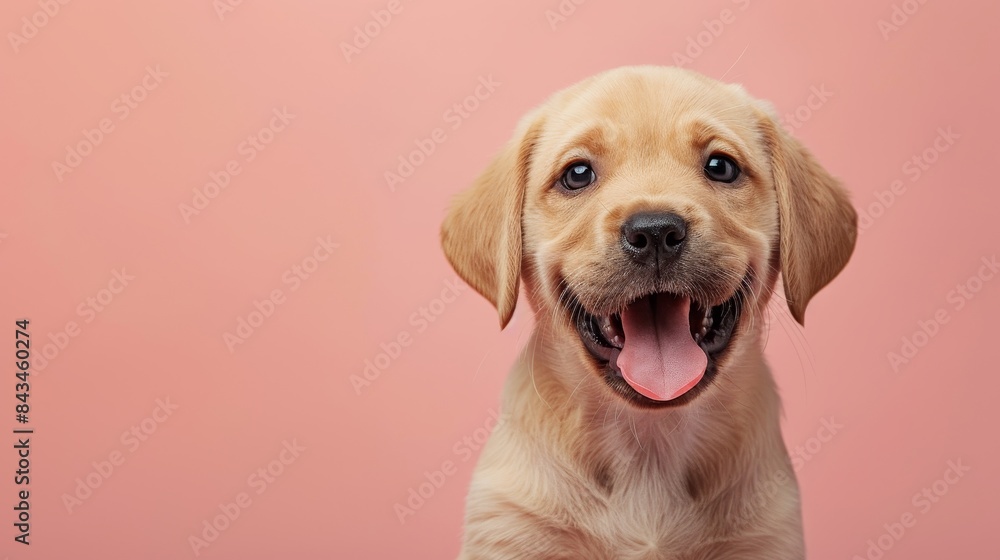 A playful Labrador puppy on a solid peach background with space above for text #843460274