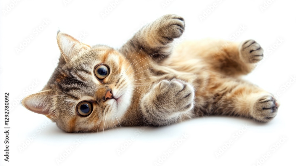 A playful Scottish Fold cat lying on its back with its paws up in the air, looking adorably surprised on a white backdrop. #1292780092