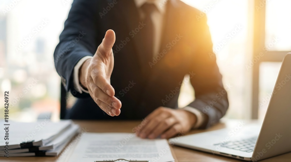 A professional businessman in a dark suit extends his hand from his office desk for a handshake, signaling a warm welcome and new business opportunities. #1918424972