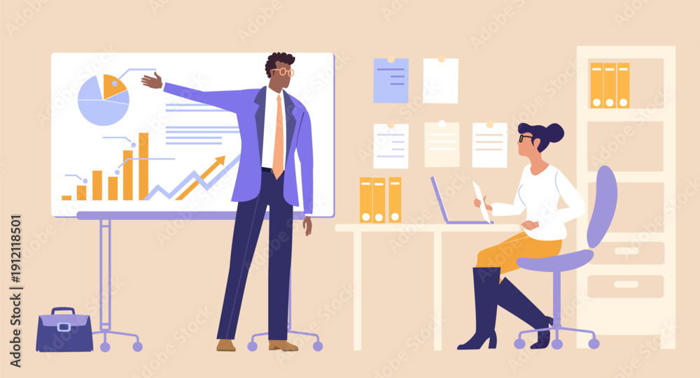 • #1945982143 Businessman presenting information on a screen, symbolising corporate communication, data analysis, leadership, training, strategy discussion, and professional knowledge sharing.