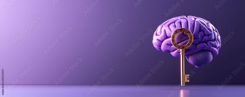 A purple brain with a golden key symbolizes unlocking potential and creativity in a visually striking manner. #1153725877