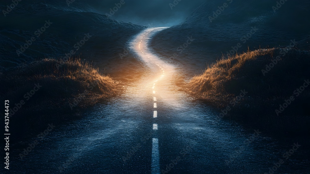 A road splitting into two distinct paths one light and one dark symbolizing the moral choices and dilemmas faced in life s journey The image provides a concept for decision making guidance #943744473