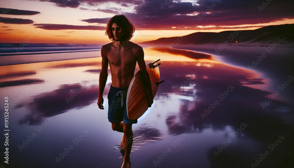 A 1960s surfer carrying his board at dusk, Ai generated image #1915245248