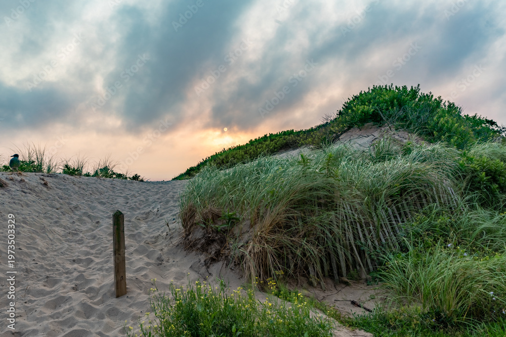 A sandy path winds between coastal dunes anchored by tall seagrasses and a weathered wooden fence. Overhead, thick gray clouds part slightly to reveal the soft glow of a setting sun casting a warm lig #1973503329