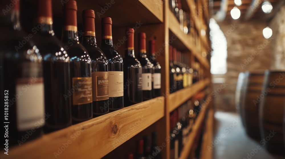 A selection of red and white wine bottles on wooden shelves in a well-lit wine store, creating a refined and inviting atmosphere. #1018285852