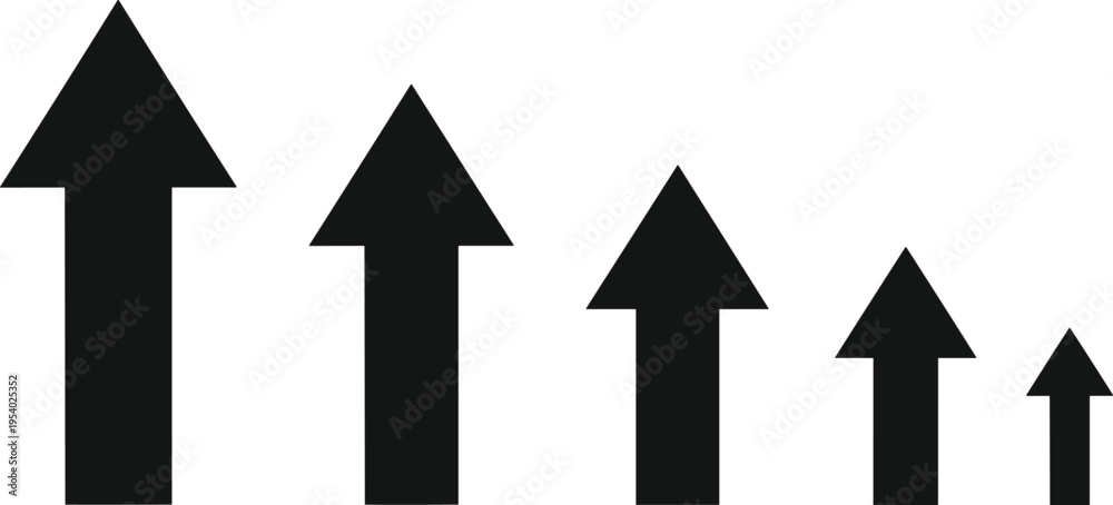 A sequence of five solid black arrows arranged in a row from largest to smallest for visual data isolated on white background #1954025352