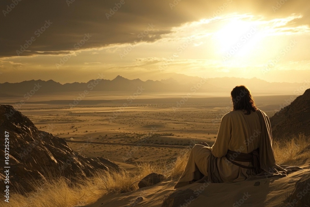 A serene depiction of Jesus reflecting on spirituality in a desert environment. #1637252987