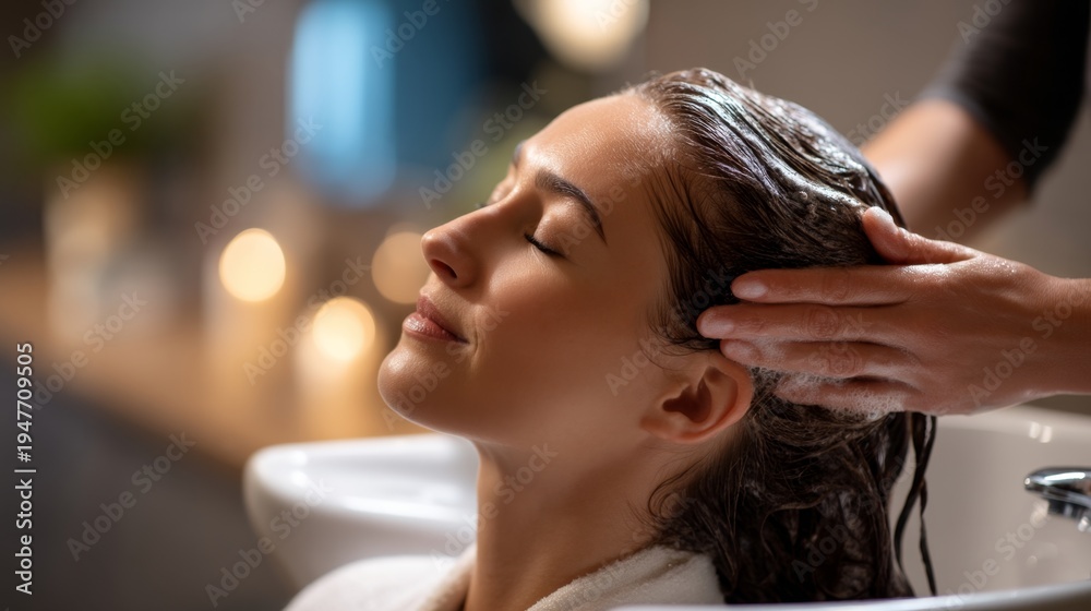 A serene moment of relaxation during a calming hair wash at a spa aesthetic. The stylish ambiance enhances the overall experience and therapeutic effects of self care. Generative AI #1947709505