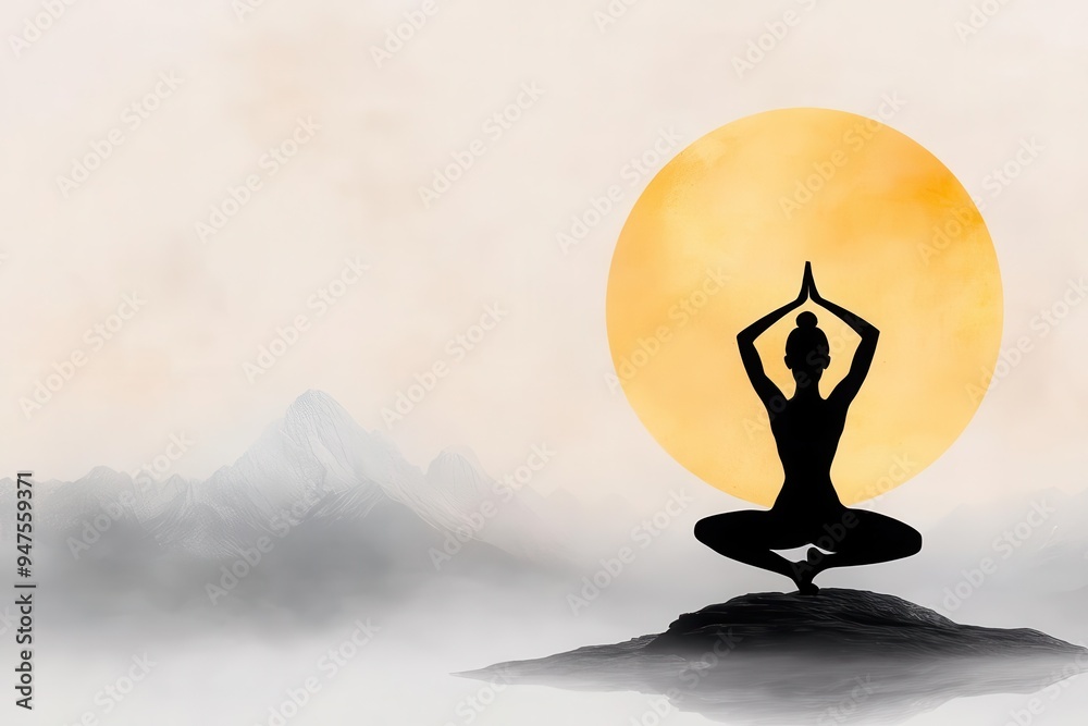 A serene silhouette of a yogi meditating against a tranquil backdrop, symbolizing peace and inner harmony. #947559371
