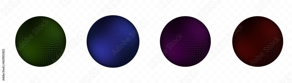 A set of abstract 3D spheres with a grid surface in the form of dots in green, blue, purple and red. Each ball has smooth gradients, a curved grid and floats on a transparent background. #1629855822