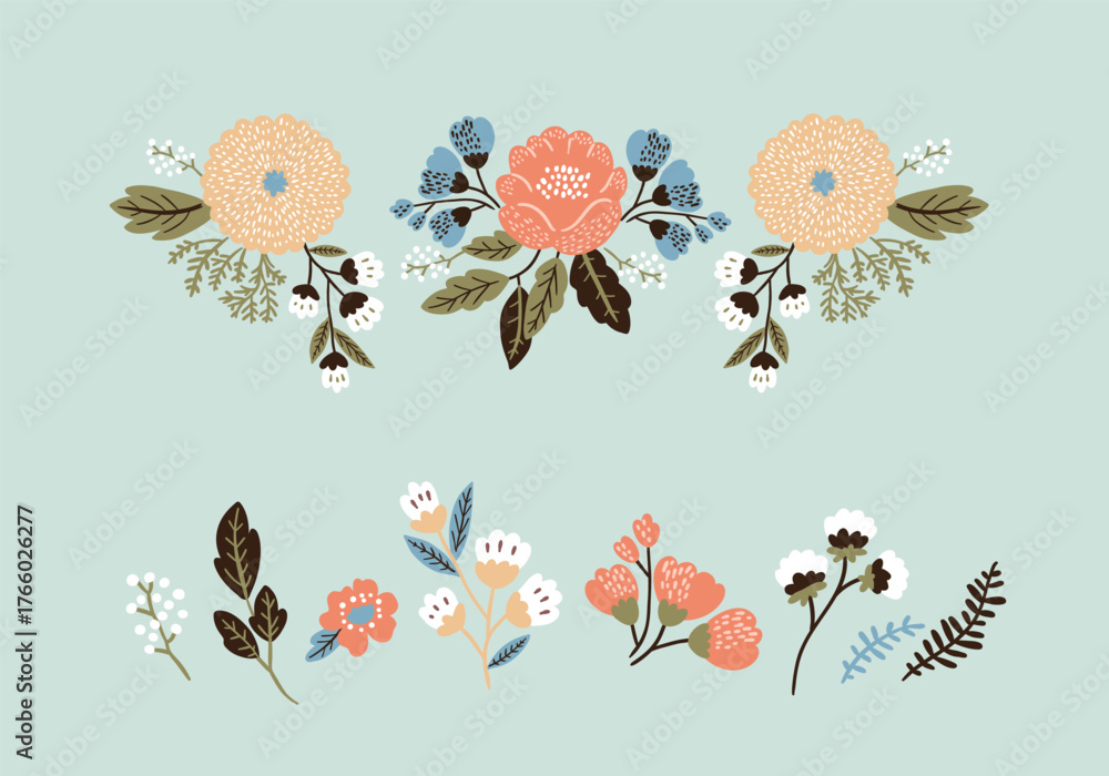 A set of floral elements and bouquets on a turquoise background. Vector illustration for design, flat style. #1766026277