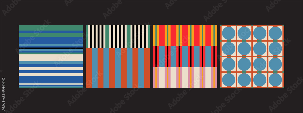 A set of modern abstract geometric patterns with colorful stripes and circle grid designs. #1793444440