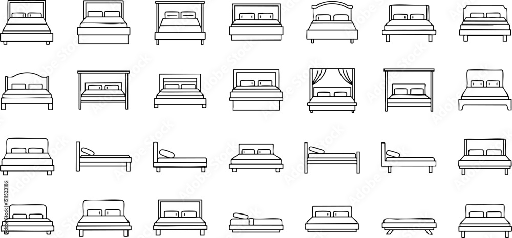 A set of simple line art illustrations depicting various bed designs, including double beds, single beds, beds with headboards, and a canopy bed, shown in elevation. #1511523186