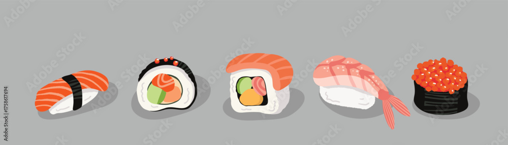 A set of stylized flat vector illustrations of rolls and sushi. Perfect for menus, stickers, advertising, and other projects. #1758617694