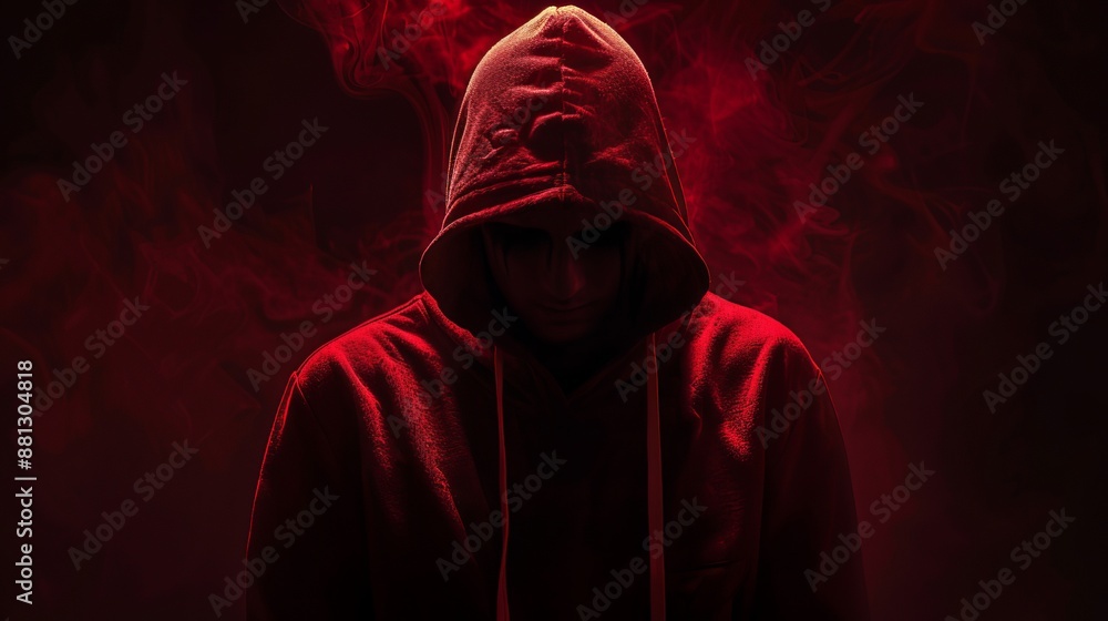 A shadowy figure draped in a red hooded cloak stands amid swirling red smoke, evoking a crimson aura and sense of danger. #881304818