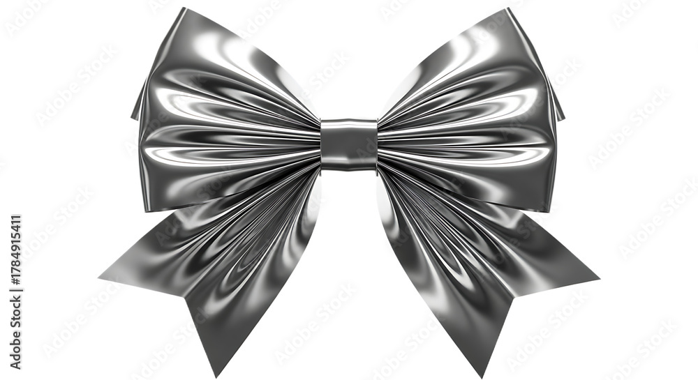 A shiny silver bow with a knot in the center against a black background for festive decorations #1784915411