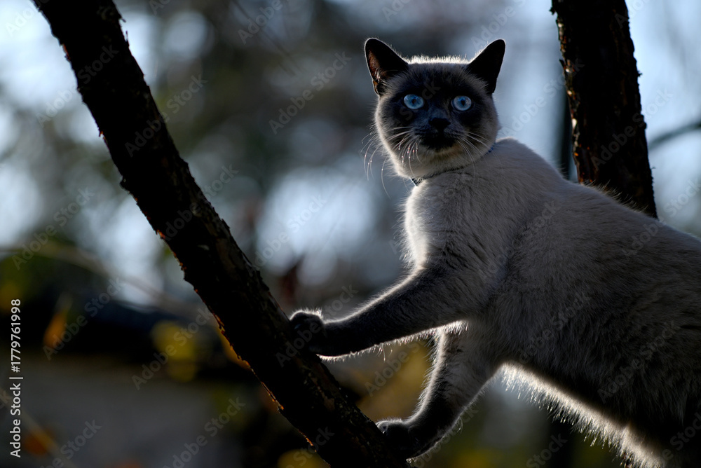 A Siamese cat climbs a tree. Selective focus. #1779761998