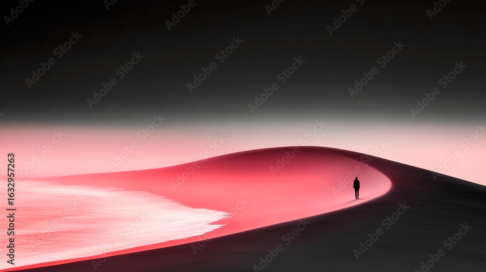A single person silhouetted against the dramatic pink and red hues of a desert landscape walking along a winding path through the undulating sand dunes #1632957263