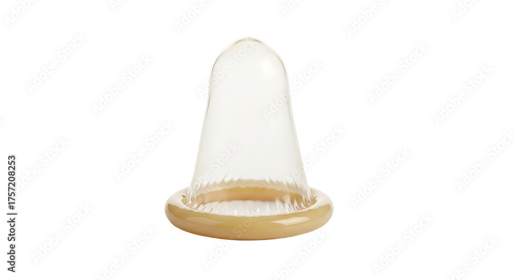A single tan condom sits upright against a stark background, illuminated by neutral lighting. #1757208253