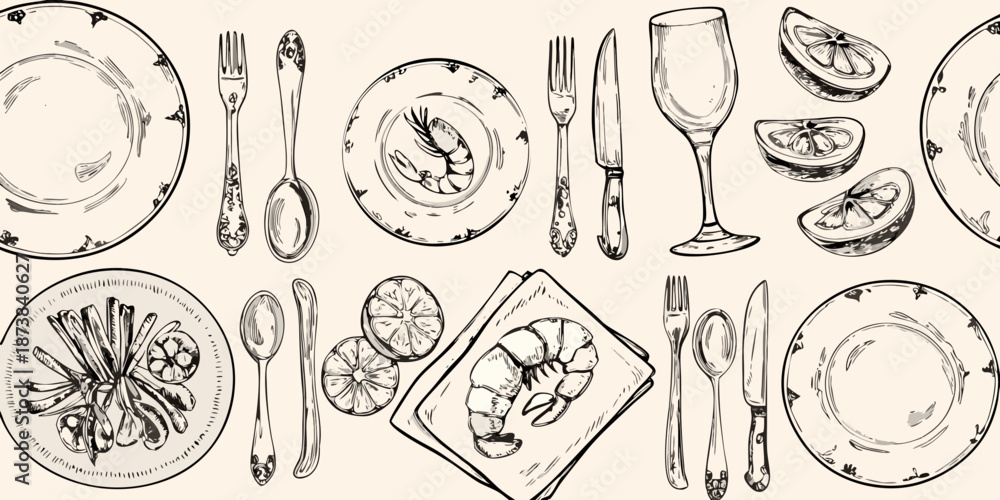 A sketched seamless pattern featuring plates cutlery shrimp and lemon slices #1873840627