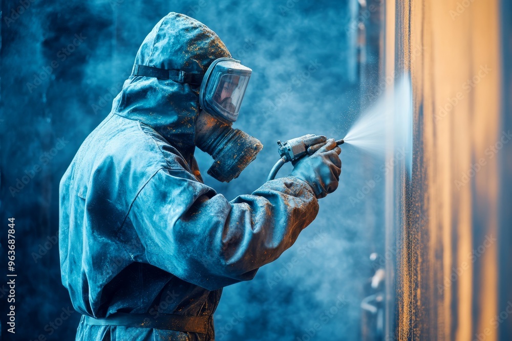 A skilled technician in a modern steel manufacturing facility expertly uses a spray gun to apply paint coatings, ensuring high quality and crucial corrosion protection during the process #963687844