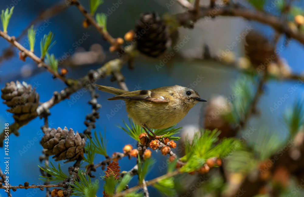 A small goldcrest bird sits on the branches of a larch tree with pine cones in a spring park #1744356188