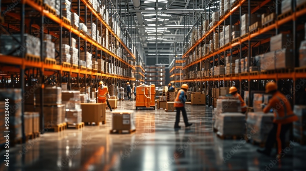 A spacious warehouse that is filled with numerous boxes and workers #958524014