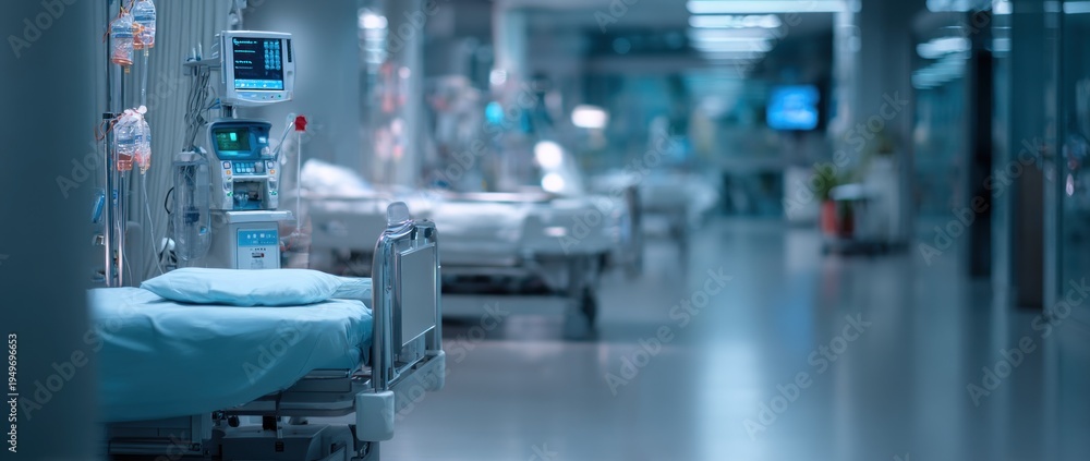 A sterile hospital corridor featuring hospital beds and medical equipment, conveying a sense of clinical care and urgency. #1949696653