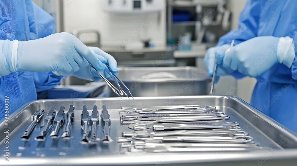 A sterile processing technician organizing surgical instruments on a table in a clean room environment #938500017