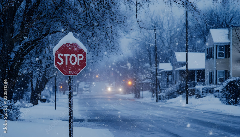 A stop sign blanketed in snow stands at a winter road near houses, signaling caution amidst falling snowflakes #1230811286