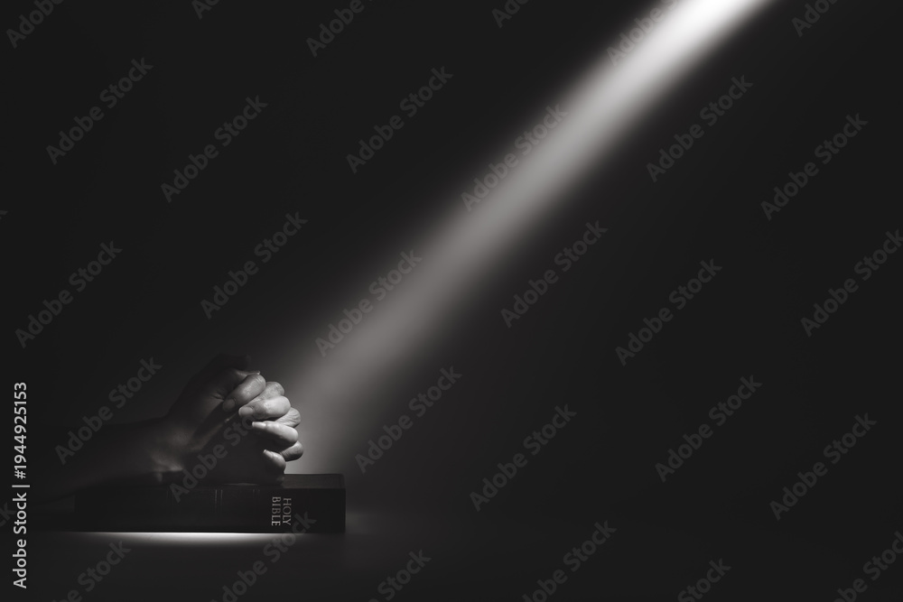 A strong beam of light illuminating a holy bible and the hands of a person praying, a background of faith and belief. #1944925153