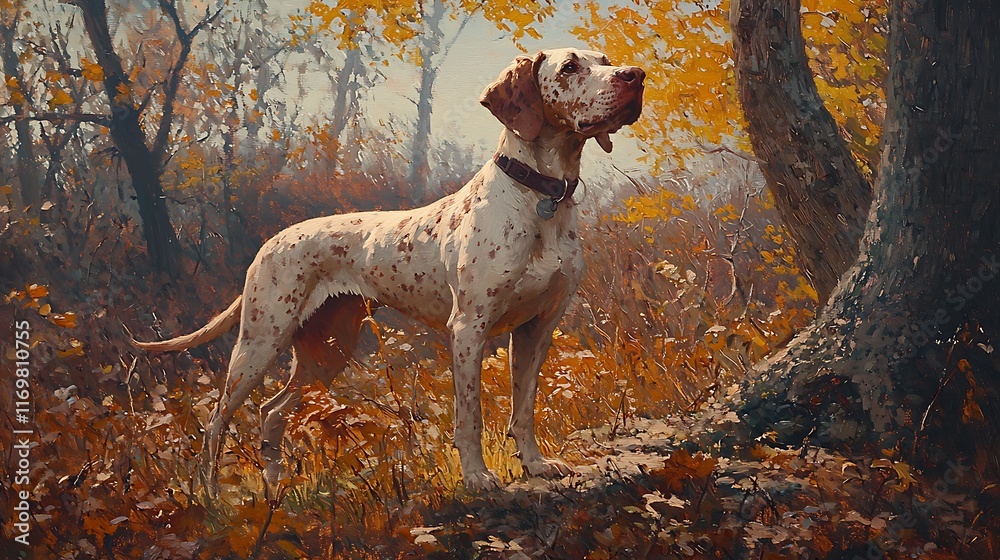 A Stunning Oil Painting of a Bracco Italiano Dog Standing in an Autumnal Forest. #1169810755