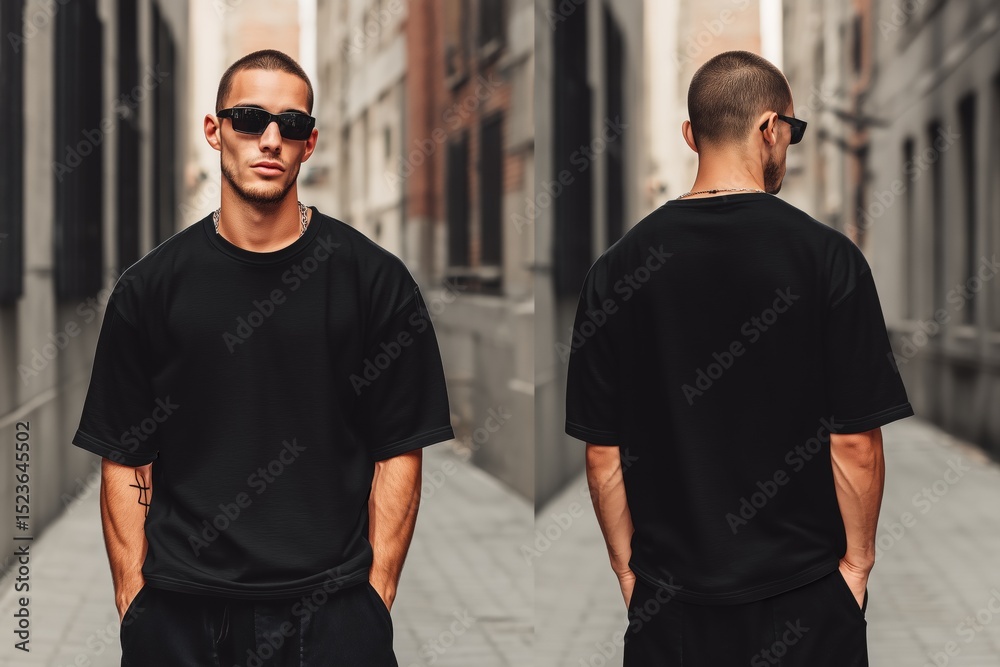 A stylish young man wearing a black oversized t-shirt mockup and sunglasses, standing confidently in an urban alley. The photo captures both front and back views, showcasing modern street fashion. #1523645502