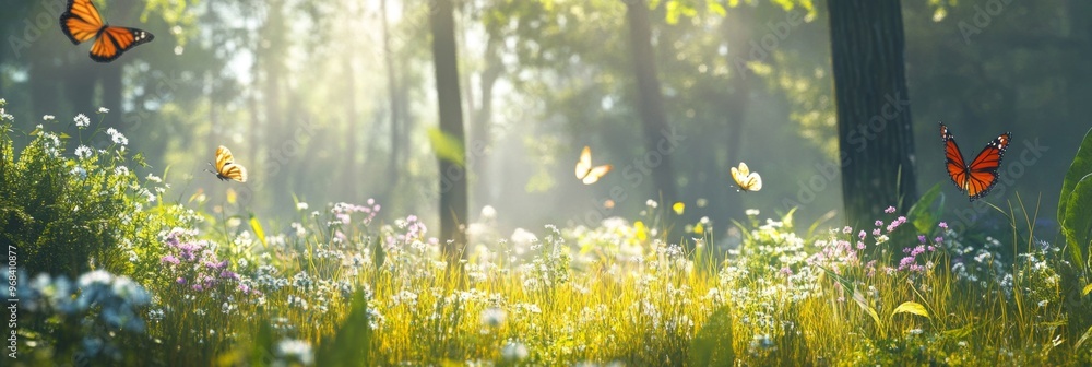 A summer forest glade filled with flowering grass and dancing butterflies on a bright sunny day #968410877